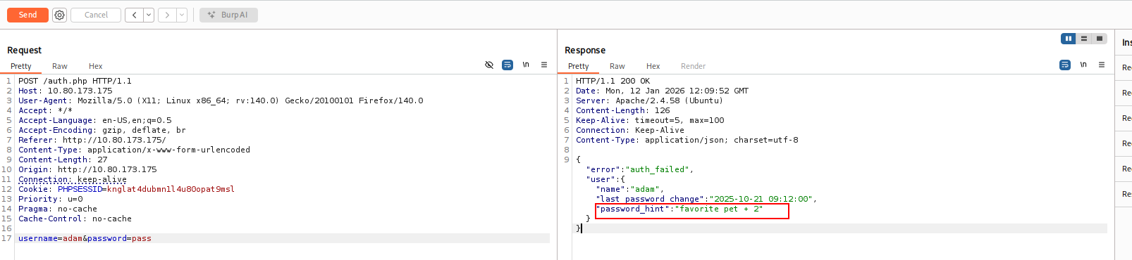 On the main webpage we have a login form. In javascript file http://10.80.173.175/check.js we can see that the data from the login form is sent to /auth.php (POST):