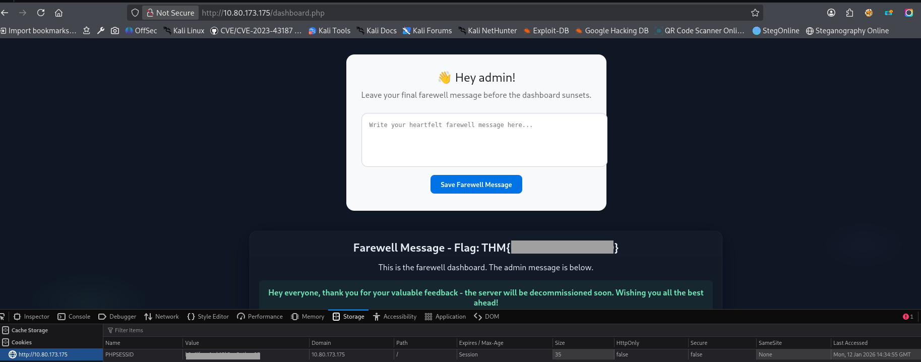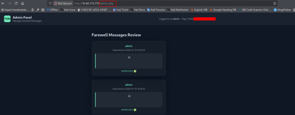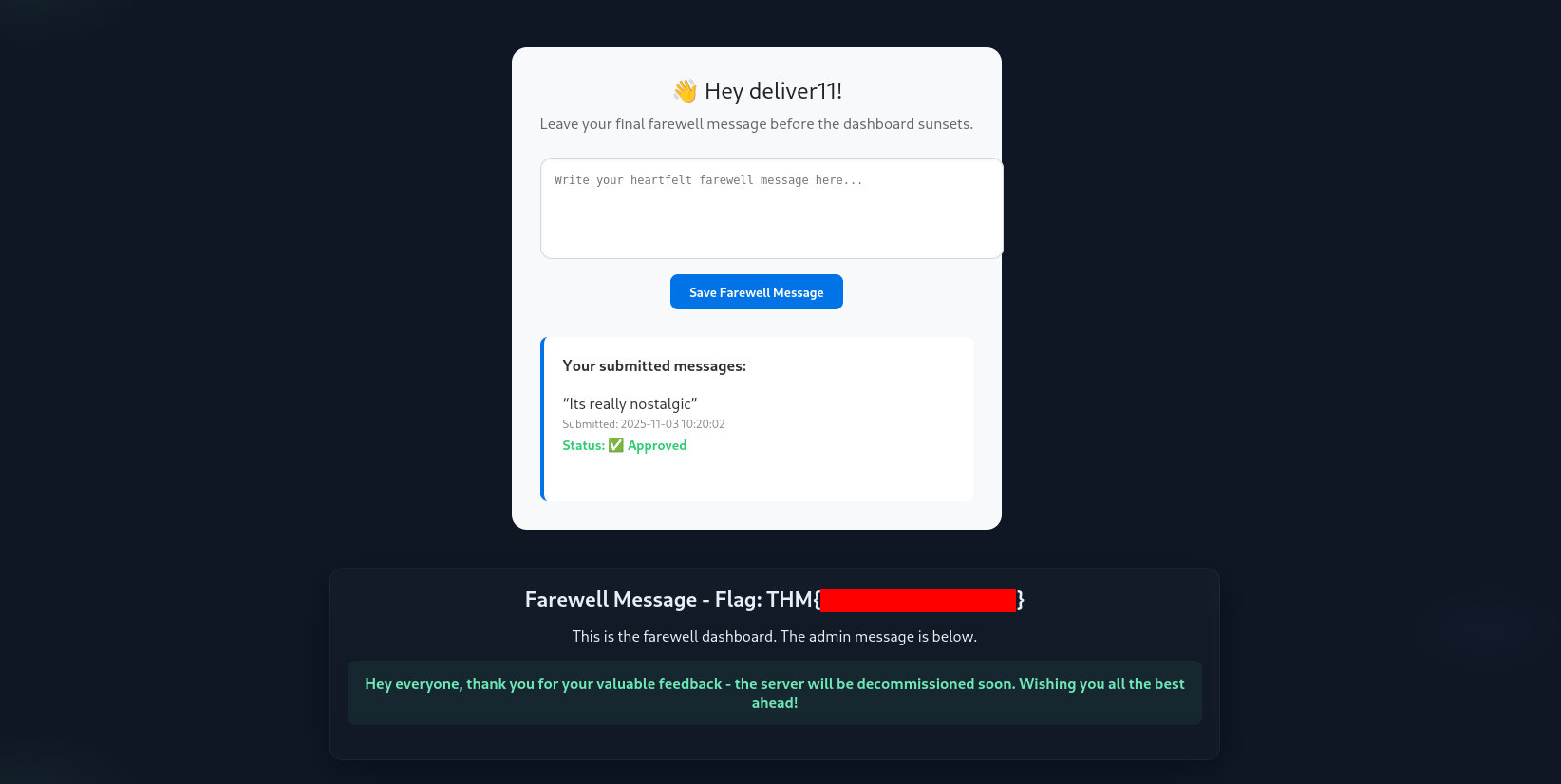 The farewell server will be decommissioned in less than 24 hours. Everyone is asked to leave one last message, but the admin panel holds all submissions. Can you sneak into the admin area and read every farewell message before the lights go out?