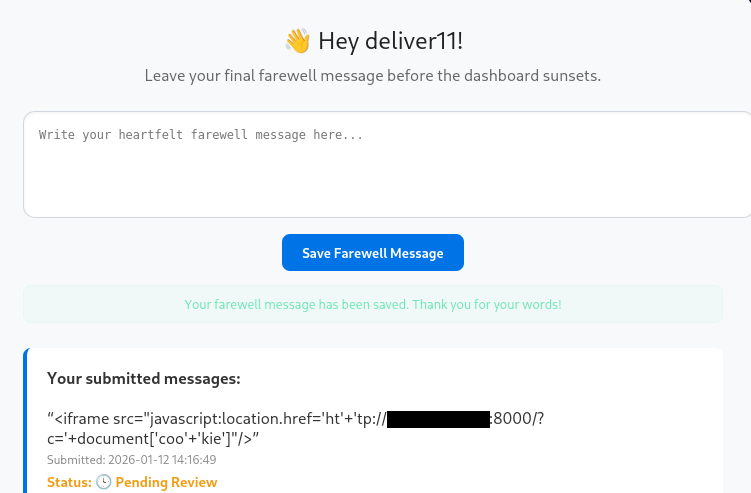 Now we need to steal the admin cookie. The form is triggering WAF alert when you type: <script>alert(1)</script> so it needs something more sophisticated.