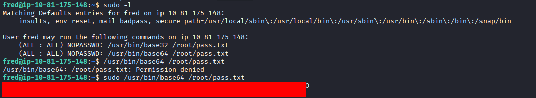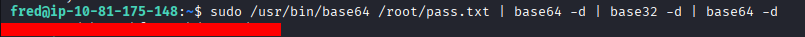 and it revealed that user fred can read /root/pass.txt using the base64 and base32 binaries.