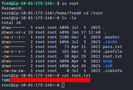 After decoding the value of FRED_SEC, I switched to user fred using the recovered password and obtained Fred’s flag.