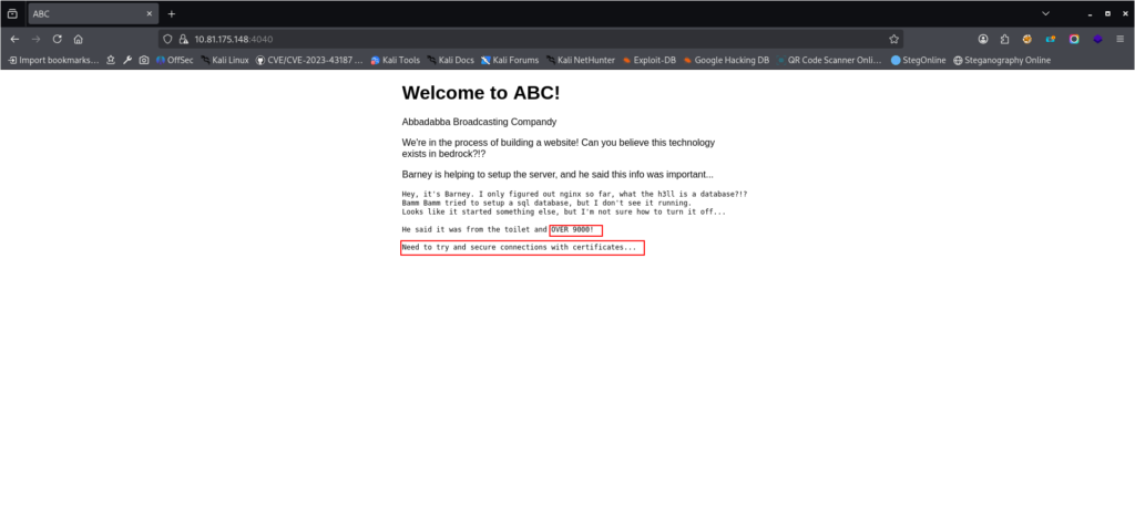 Port 80 redirects to 4040, where a simple web page is displayed.