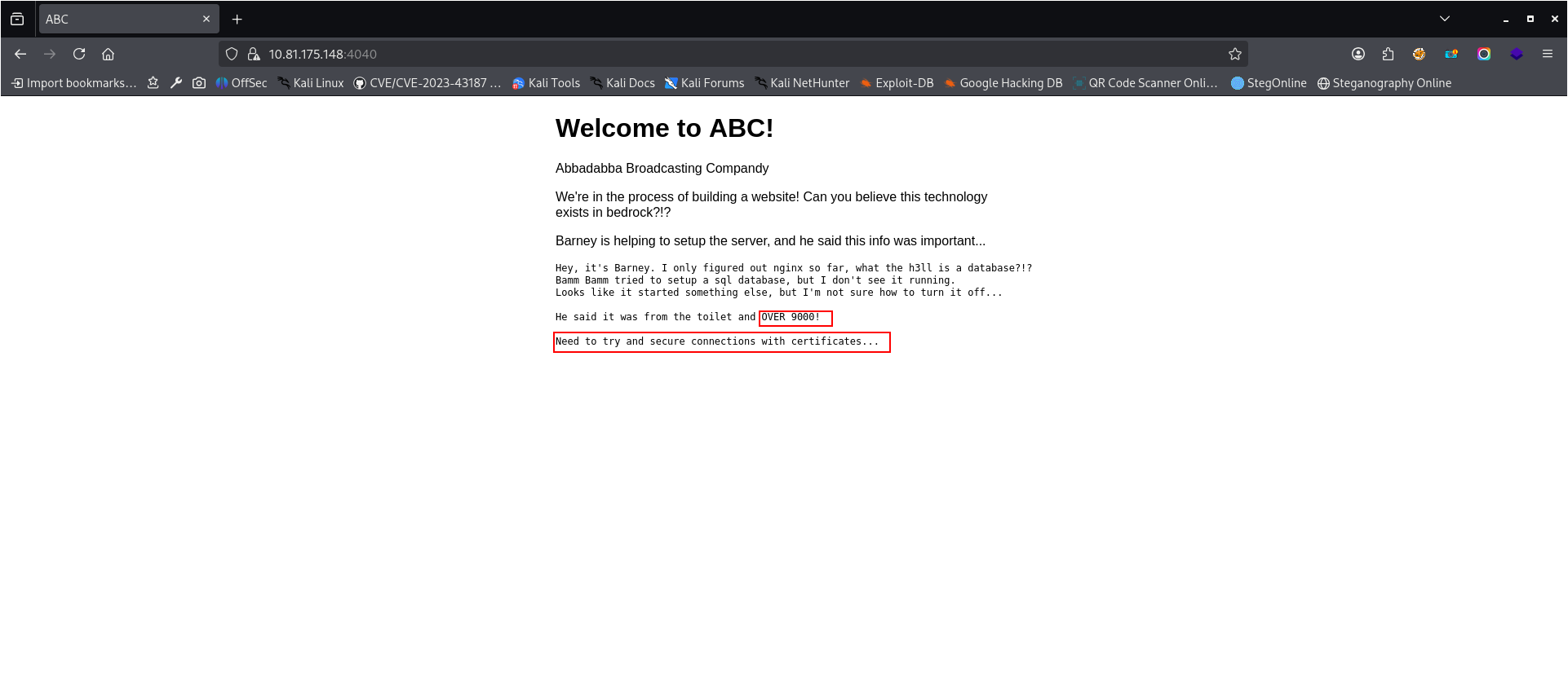 Barney is setting up the ABC webserver, and trying to use TLS certs to secure connections, but he’s having trouble. Here’s what we know…