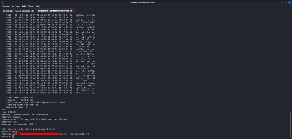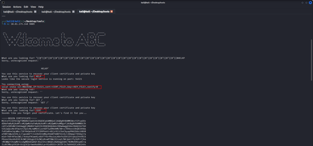Using the leaked certificate and private key, I connected to the TLS-protected service on port 54321: