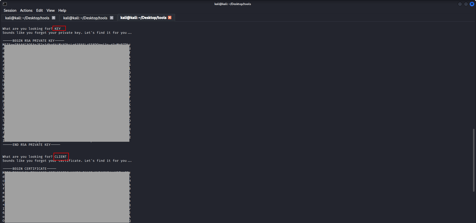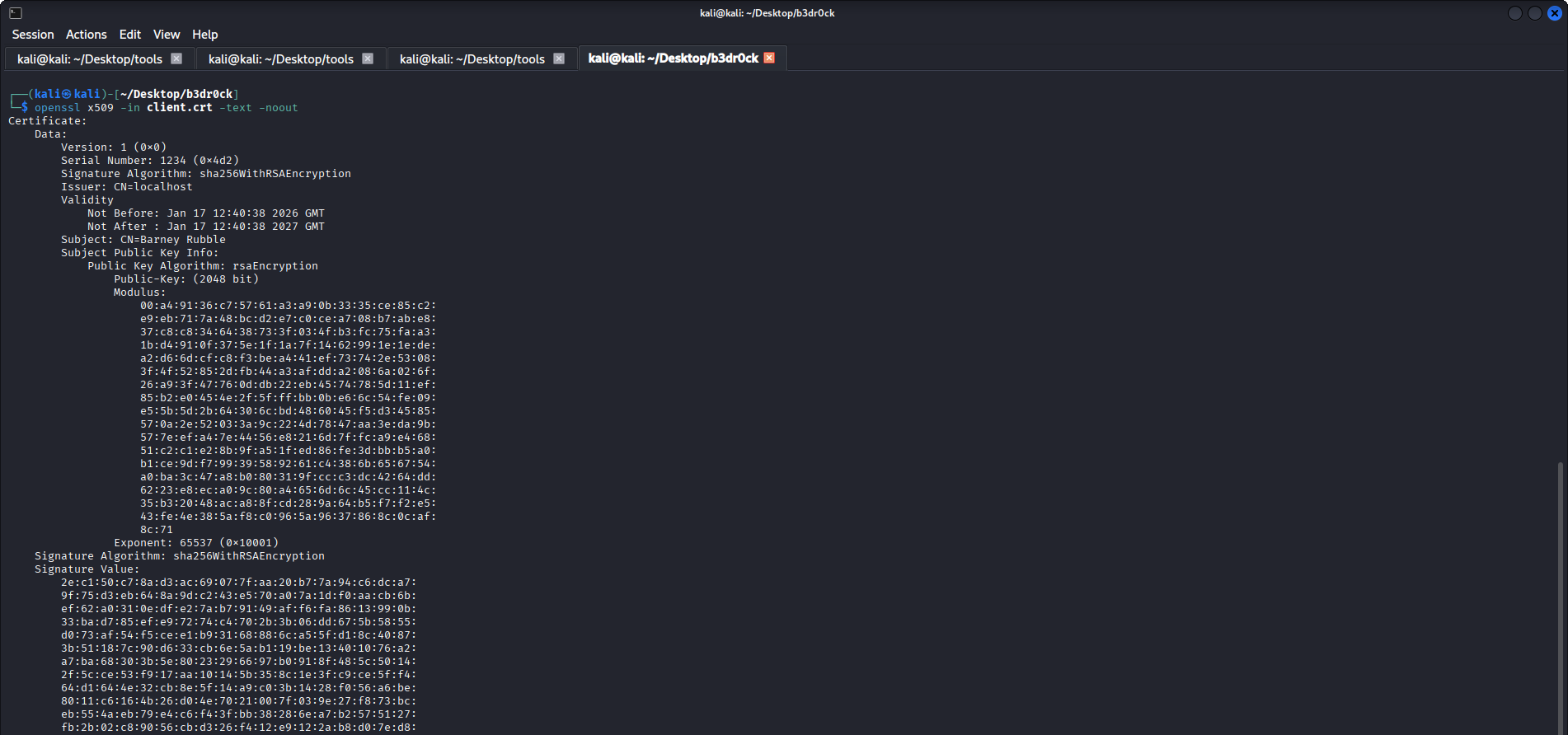 This confirms that client certificate authentication was effectively bypassed due to the earlier leak.