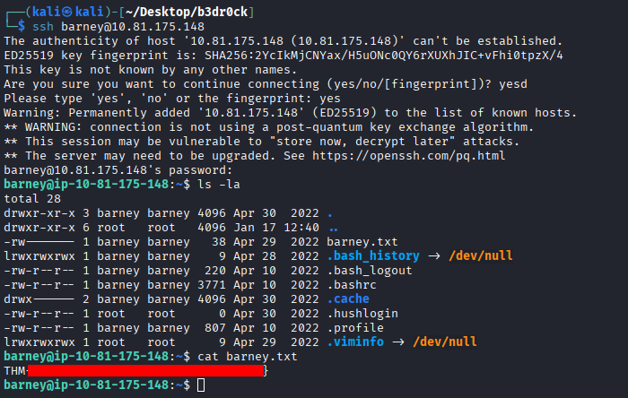 Using the password obtained in the previous step, I successfully logged in via SSH as the barney user and obtained the first flag.