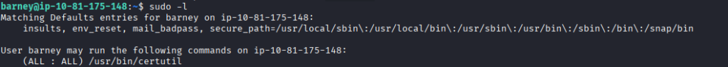 User barney is allowed to execute a binary named certutil with elevated privileges.