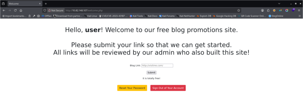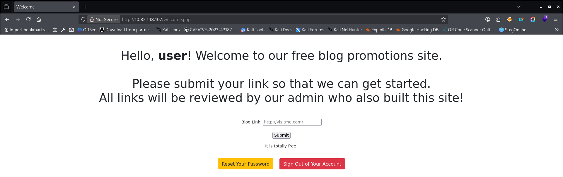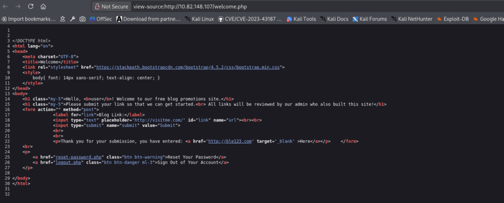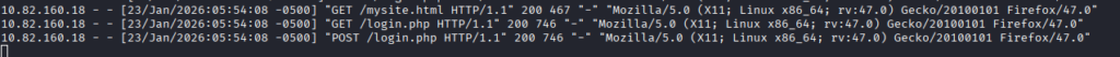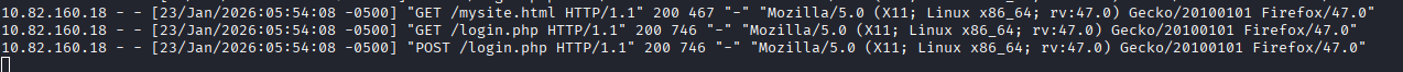 sudo systemctl start apache2 And submitted the link to http://ATTACKER_IP:80/mysite.html in the form. After a while in apache logs, I had a connection – first to mysite.html and the second one to login.php
