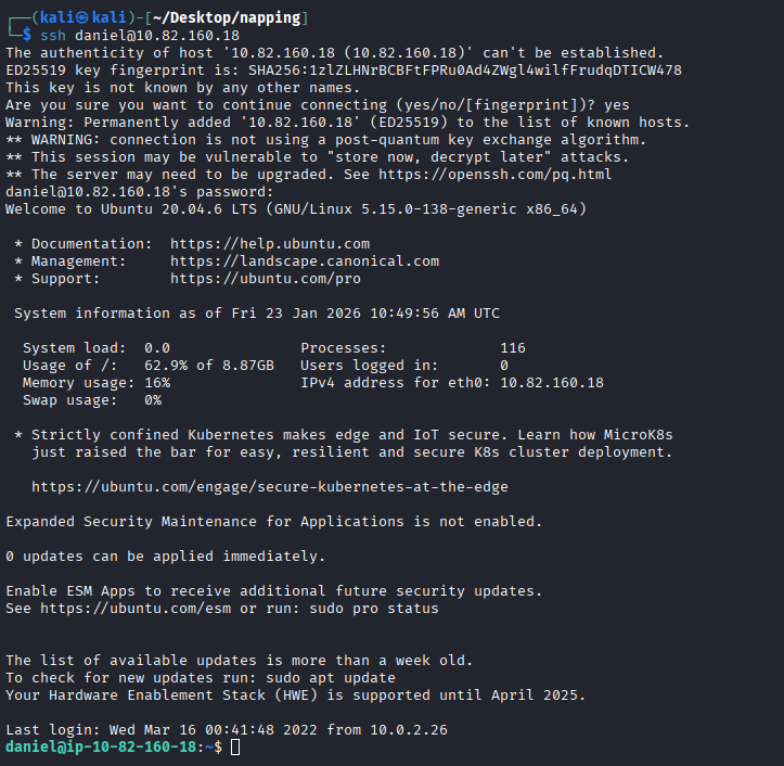 Credentials were reused, so I was able to connect using the same username and password via SSH