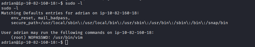 I used `sudo -l` command to check what can be executed by adrian with sudo privileges: