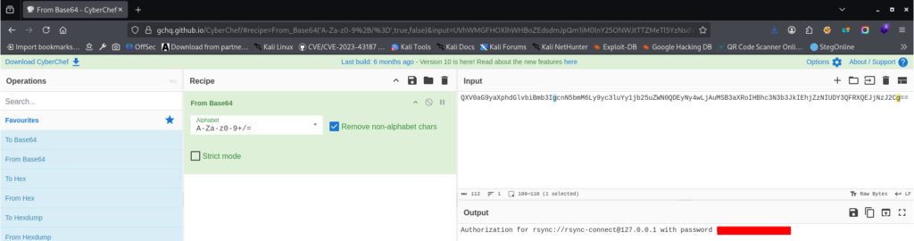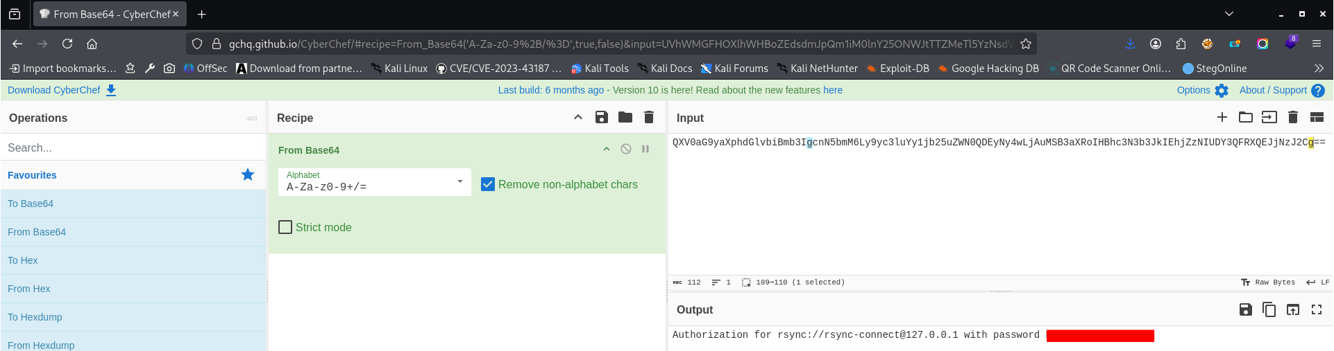In the authlist, we have some base64 encoded values. After decoding, we can see that it is the rsync password: