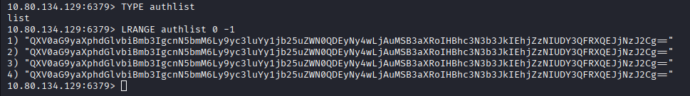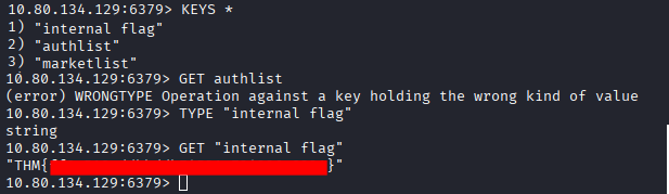 redis-cli -h TARGET_MACHINE_IP -p REDIS_PORT -a PASSWORD We can read some data, including flag: