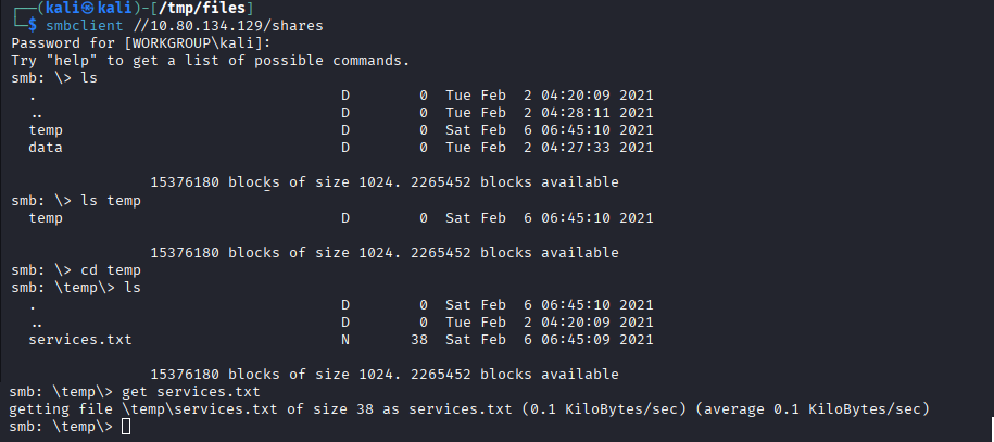 enum4linux -a TARGET_MACHINE_IP and download flag placed in services.txt to our machine: