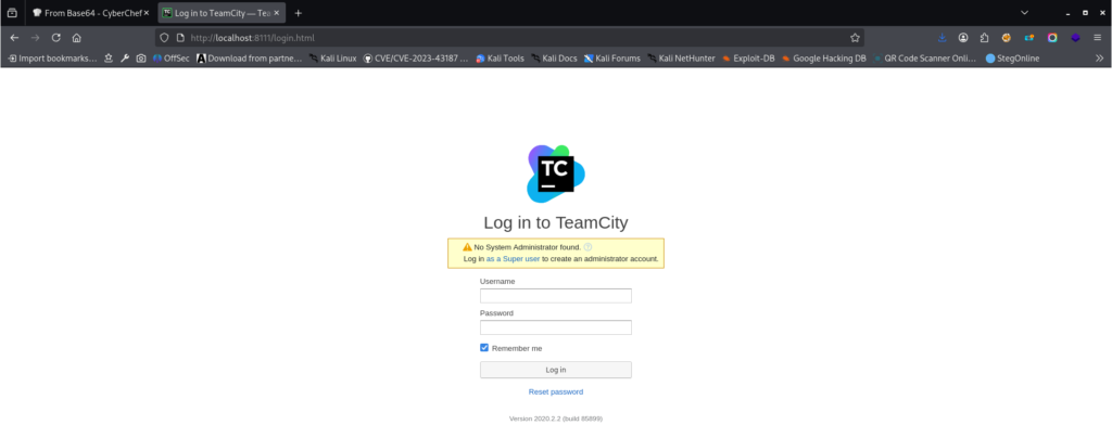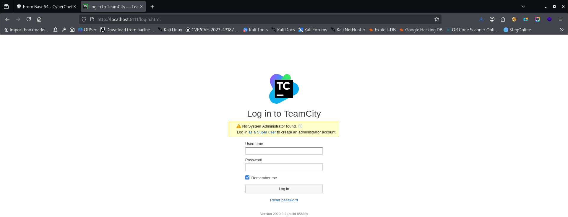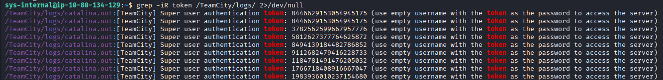 After logging in via ssh as sys-internal we can explore some directories. In root directory we have TeamCity folder. In Catalina/catalina.out we can see that there is some authentication token.