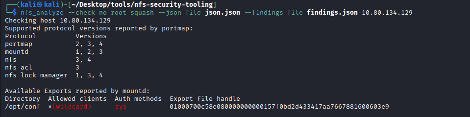 nfs_analyze --check-no-root-squash --json-file json.json --findings-file findings.json TARGET_MACHINE_IP